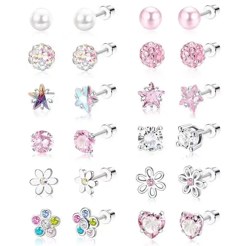 12 Pairs Hypoallergenic Surgical Stainless Steel Stud Earrings for Girls Kids Women Daughter Fashion Zircon Crystal Pearls Stud