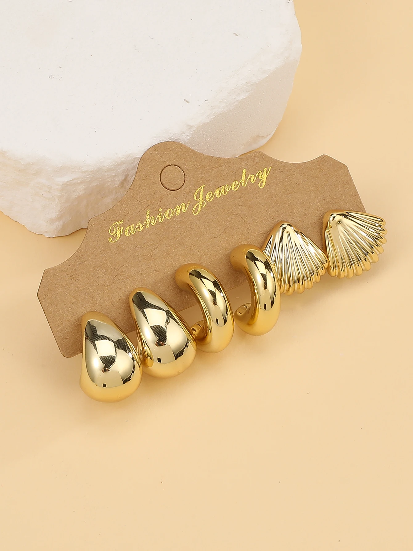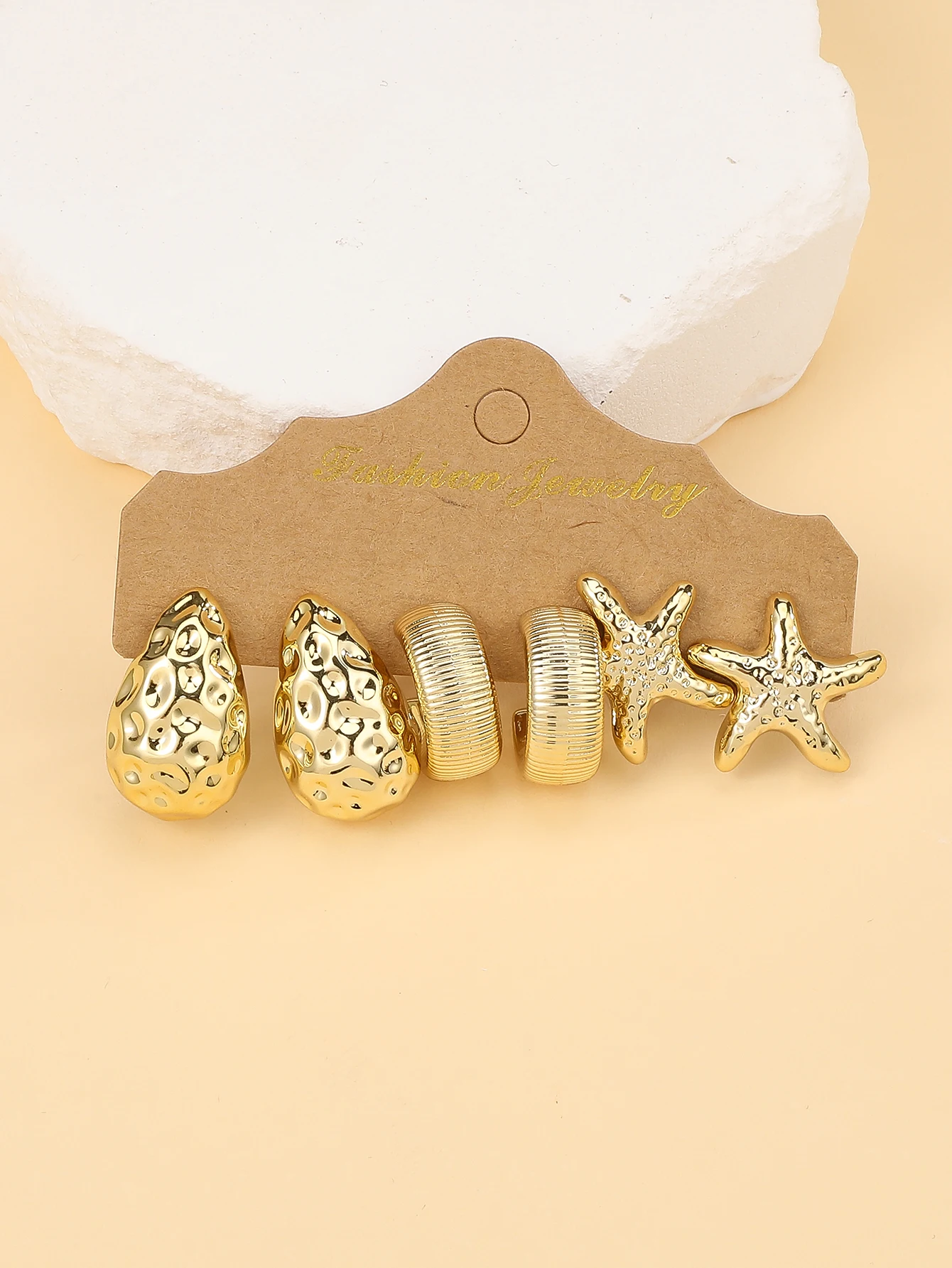 3PAIRS-6PAIRS/Set Fashionable &Golden Starfish, Seashell, Smooth Water Drop,Textured C-Shape Earrings Set,Travel & Vacation Wear